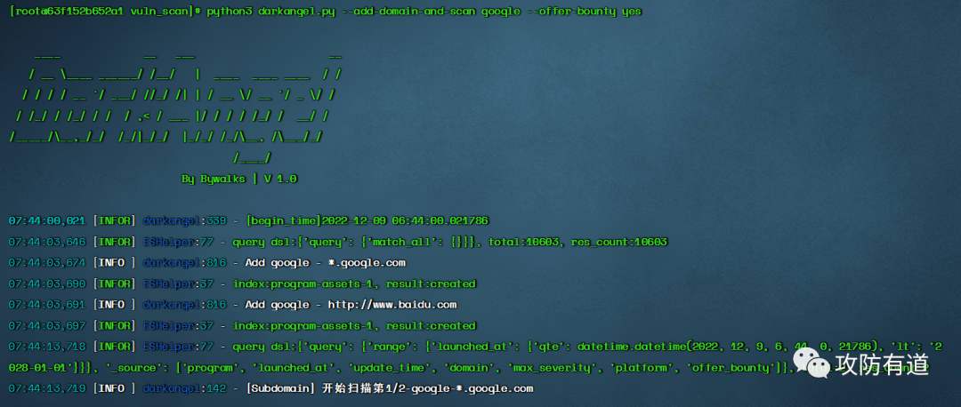 1拉取扫描器镜像 2 3docker pull bywalkss/darkangel:v1 4 5 6部署扫描器 7 8docker run -it -d -v /root/darkangel:/root/darkangel --name darkangel bywalkss/darkangel:v1