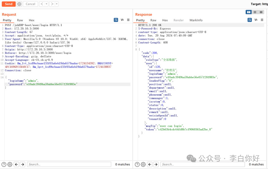 1POST /jshERP-boot/user/login HTTP/1.1 2Host: IP 3Content-Length: 67 4Accept: application/json, text/plain, */* 5User-Agent: Mozilla/5.0 (Windows NT 10.0; Win64; x64) AppleWebKit/537.36 (KHTML, like Gecko) Chrome/127.0.0.0 Safari/537.36 6Content-Type: application/json;charset=UTF-8 7Origin: http://172.20.10.3:3000 8Referer: http://172.20.10.3:3000/user/login 9Accept-Encoding: gzip, deflate 10Accept-Language: zh-CN,zh;q=0.9 11Cookie: Hm_lvt_1cd9bcbaae133f03a6eb19da6579aaba=1724134392; HMACCOUNT=4FC1696FCCBA0C17; Hm_lpvt_1cd9bcbaae133f03a6eb19da6579aaba=1724138837 12Connection: close 13 14 15{"loginName":"admin","password":"e10adc3949ba59abbe56e057f20f883e"}