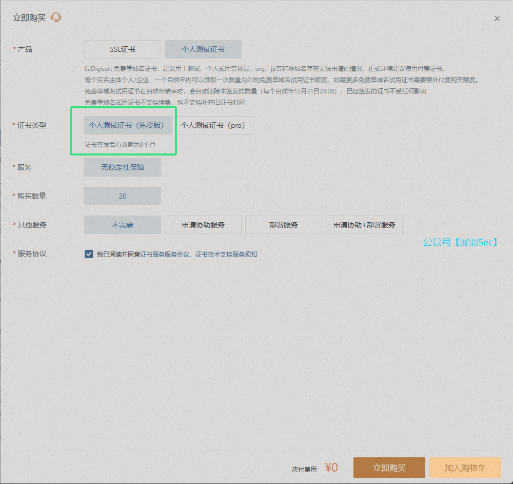 我们购买一个个人测试证书,这里是免费的有效期只有三个月