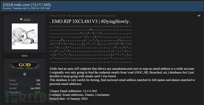 近日,有黑客发布了与 Trello 账户相关的 1500 万个电子邮件地址,这些地址是今年 1 月被 API 收集到的。当时有一个名为 “emo ”的威胁行为者在一个流行的黑客论坛上出售 15 万个 Trello 会员的资料。