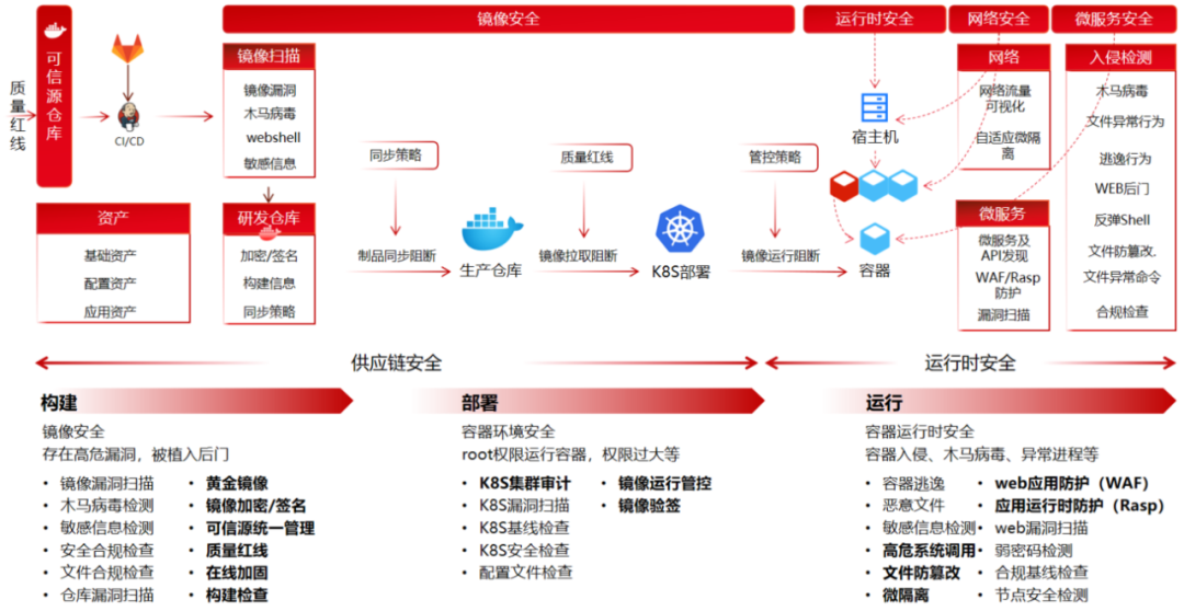 针对容器出现的风险和威胁,应用了智能检测、机器学习与威胁预测等先进的方法来确保容器及容器内应用安全。在容器的安全生命周期中,采用自动检测、分析和处理的方式,防御容器生命周期(模板、镜像和容器)中所遇到的安全威胁。