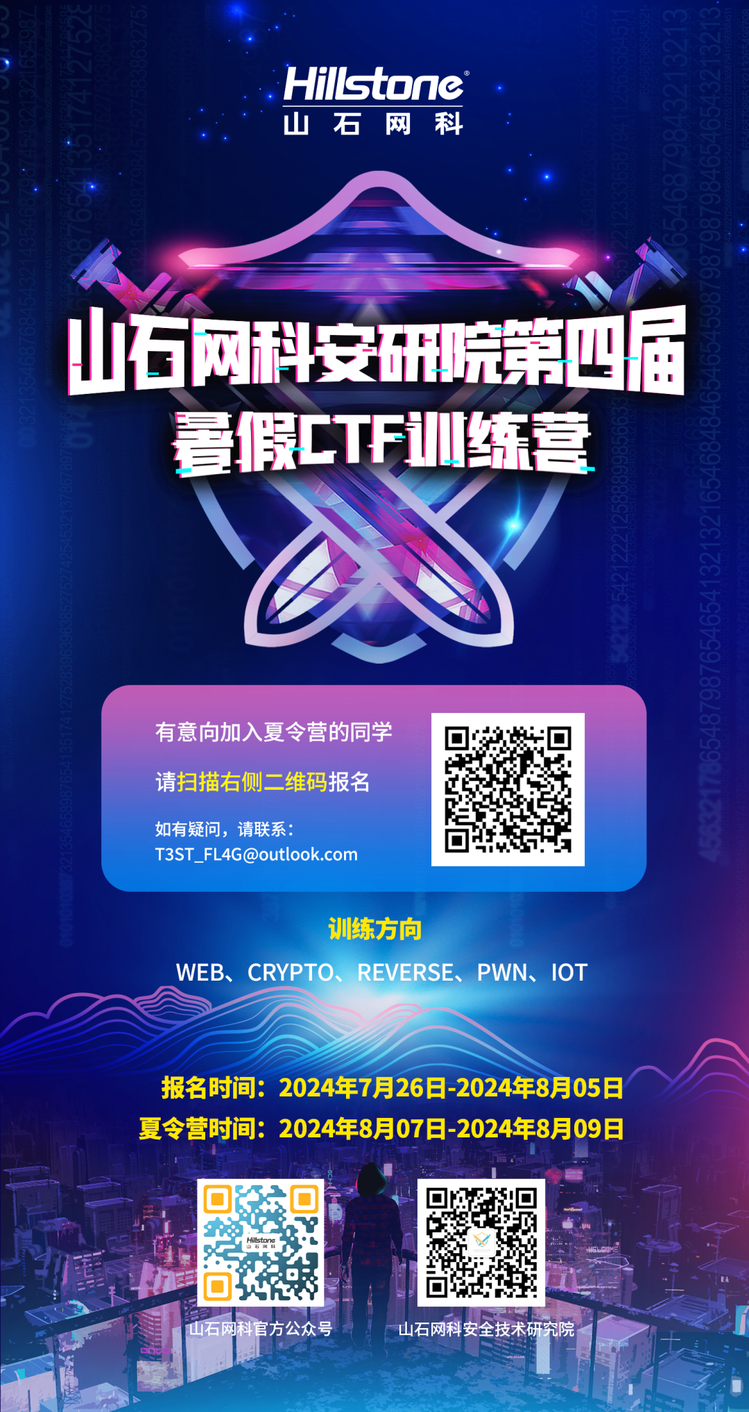 即将进入到炎热的八月,暑假不知不觉溜走一半,不如抓紧剩下的时间参加一场真枪实弹的训练营吧!山石安研院在2024年的暑假里,推出了第四届“暑假CTF训练营”。在这里,你可以接受CTF的培训指导,收获满满干货,结识志同道合的伙伴
