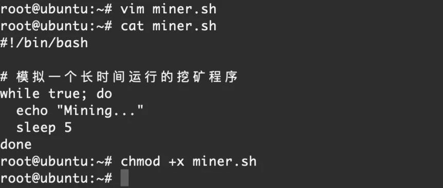 结合之前的《trap使用》,在这里模拟一个挖矿程序,并通过trap将这个程序隐藏。编写如下\x26quot;挖矿\x26quot;程序(miner.sh),#!