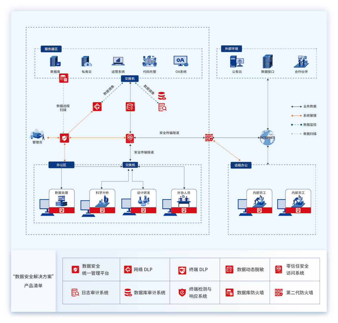 通过用户异常行为分析、敏感数据智能识别、外发全通道管控能力三位一体一体化解决企业面临的数据泄漏风险,为企业建立全域数据安全和运营的治理体系