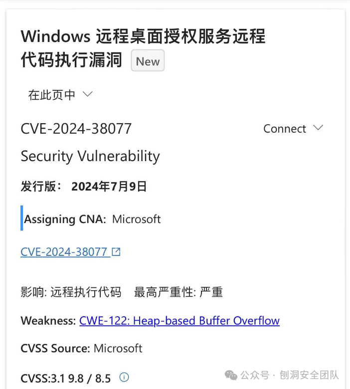 近期,微软披露最新的远程代码执行超高危漏洞CVE-2024-38077, CVSS评分高达9.8 ,可导致开启